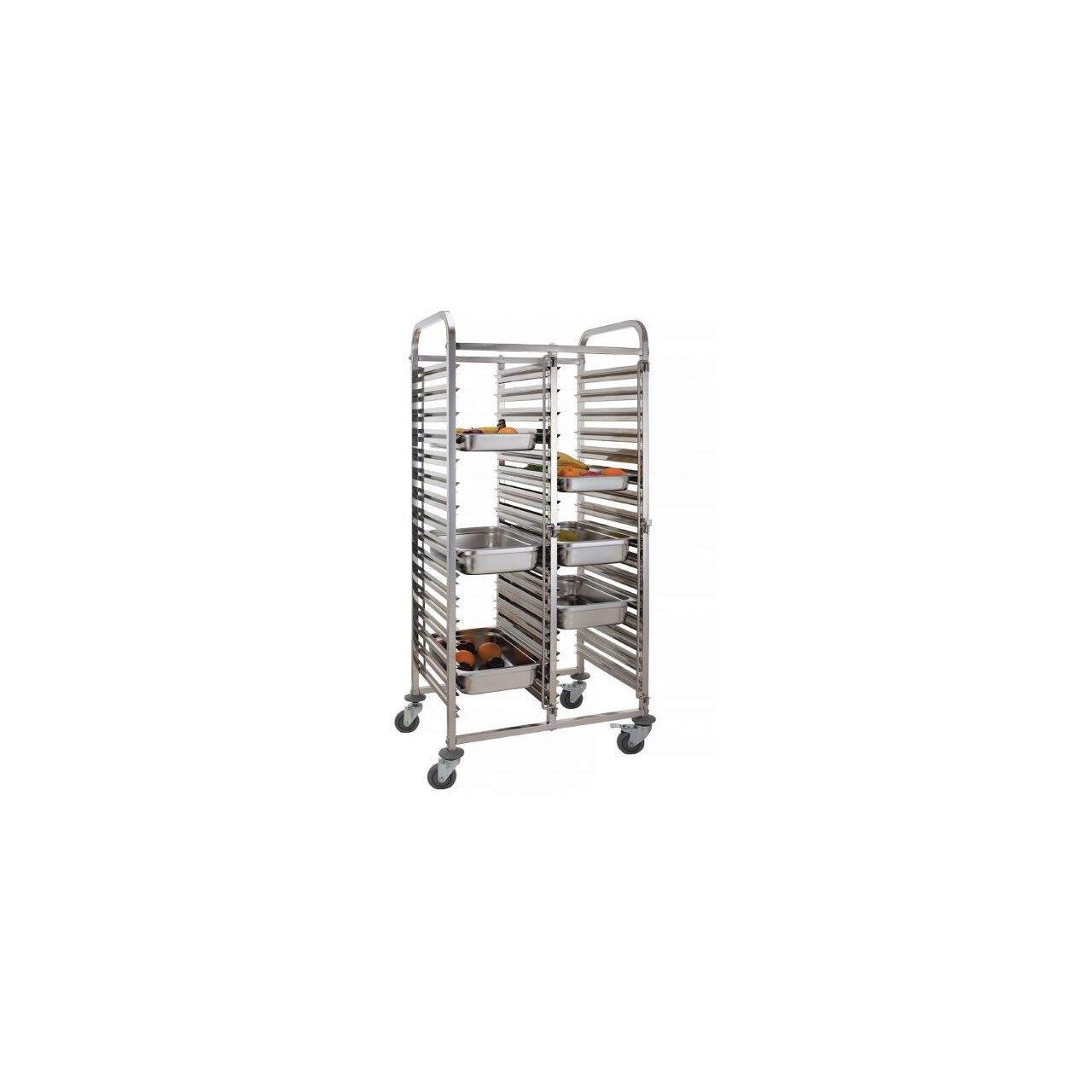 Un cărucior pentru transportul containerelor GN, 30 de standuri, dimensiuni GN 1/1 și înălțime 1710 mm. Căruciorul este echipat cu protecție pe ambele cafețe împotriva căderii tavilor. Este perfect pentru gastronomie mare și mică, companii de catering, școli și spitale.